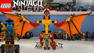 Конструктор состоит из 563 деталей и предназначен для детей от восьми лет. Игрушечный дракон высотой 27 см, длиной 27 см и шириной 59 см (стойка на задних лапах с распростертыми крыльями) идеально подходит как для увлекательной игры, так и для демонстрации (может стать важным элементом домашней коллекции). В набор также входят четыре минифигурки персонажей из сериала «Ниндзяго»- ниндзя Кайд, Зейн, Ния Наследие (уникальная коллекционная фигурка), а также их свирепый враг Виплэш.