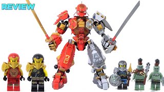 В наборе предусмотрены 5 мини-фигурок из мультфильма «Ниндзяго: мастера Кружитцу»: Кай, Ния, Коул, Майя и Мерт, для которых можно придумать много интересных сюжетов. В груди робота имеется кабина для двух фигурок, а на его руках расположены две действующих пушки, стреляющих шипами. Дети могут участвовать в ролевой игре, выбрав сторону битвы и сражаясь в увлекательном игровом поединке.