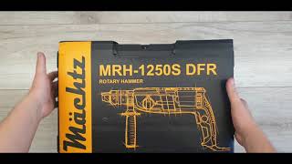 Особенностью перфоратора Machtz MRH-1250S DFR является наличие механизма, позволяющего быстро и легко менять патроны. В комплекте есть два патрона: обычный быстрозажимной (под сверла с круглыми хвостовиками) и SDS+ (под специальную буровую и ударную оснастку). Инструмент весит 3.2 кг и имеет кабель питания длиной 3 м. Перфоратор поставляется в комплекте с пластиковым кейсом, дополнительной рукояткой, ограничителем глубины сверления и набором принадлежностей, включающим пику, зубило и три бура разных размеров (⌀8 мм, ⌀10 мм и ⌀12 мм).