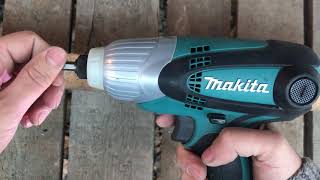 Компактный и легкий ударный гайковерт (шуруповерт) с сетевым питанием и патроном-шестигранником, созданный одним из мировых лидеров рынка ручного электроинструмента — компанией Makita. Такой тип ударного инструмента отличается очень высоким крутящим моментом (100 Нм), но при этом он гораздо меньше напрягает руку оператора. Уверенно справляется с закручиванием болтов, гаек, винтов, шурупов и прочих крепежей, однако нужно понимать, что инструмент лишен ограничителя крутящего момента и этот параметр оператору приходится регулировать вручную.