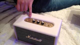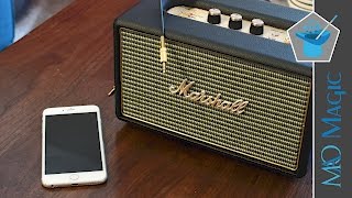 Имеет сравнительно небольшие габаритные размеры и умеренный вес. Фронтальная панель устройства декорирована аудиотканью с фирменным логотипом, корпус имеет эффектную кожаную фактуру, а алюминиевые ручки переключателей и регуляторов создают ощущение солидности и надежности. Аудиосистема Marshall Acton оборудована линейным входом AUX IN (фирменный витой кабель с разъемами 3-pin mini-Jack 3.5mm в комплекте) и интегрированным bluetooth-адаптером, обеспечивающим беспроводную передачу аудиосигнала на расстоянии до 10 м.