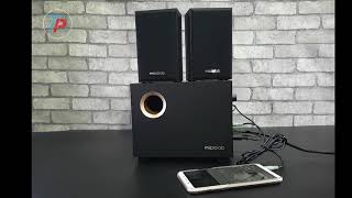 Двухполосные сателлиты выполнены из пластика, а сабвуфер из МДФ. Регулятор громкости расположен на боковой панели сабвуфера с противоположной стороны от фазоинвертора. Регуляторы низких и высоких частот отсутствуют, пуль ДУ тоже не предусмотрен. Для подключения используется стандартный 3.5-мм миниджек. Чтобы упросить жизнь пользователю, система умеет автоматически переходить в режим энергосбережения.