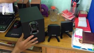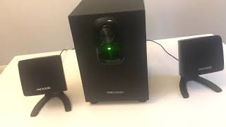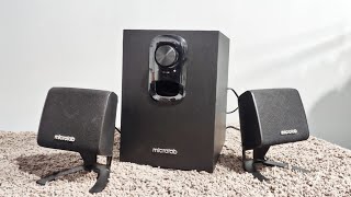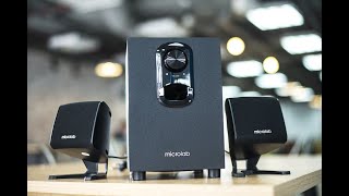 Активная акустическая система класса 2.1 от Microlab со встроенным усилителем. В нее входят настольные сателиты-пищалки и компактный сабвуфер, который обычно размещают на полу под столом. Microlab M-108 отличается от других популярных систем класса 2.1 своими габаритами. Общий вес комплекта составляет всего 2 кг, а суммарная мощность составляет скромные 11 Вт (6 Вт сабик + 2.5 Вт для каждого саттелита).