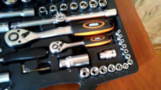 Покупал себе для Шкоды, ну и вообщем по хозяйству. Показал себе отлично, есть звездочки(TORX), владельцы шкод меня поймут) Все насадки сделаны с качественной стали. Большой трещоткой срывал ржавые болты на 19 и 22 — выдержала на "отлично"(хотя есть вороток). Отдельной похвалы заслуживает кейс: пластик толстый и очень прочный, закрывается плотно, и ничего не люфтит. За эти деньги очень достойная вещь! Качество, прочный кейс, не ломучие трещотки, цена Не обнаружил |