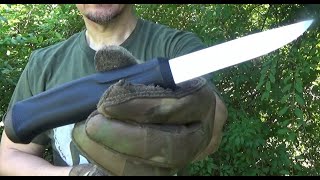 ![]() | Товар устарел Недорогой нож для повседневного использования специализированной марки Mora — это универсальная модель, способная заинтересовать походников, рыбаков, охотников и других любителей активного отдыха на природе. К характерным особенностям изделия относится нескладная (фиксированная) конструкция, небольшой общий вес, равный 88 граммам, а также наличие в комплекте поставки пластиковых ножен, которые выполнены в характерном скандинавском дизайне. Нож Mora 510 получил остроконечный клинок с гладкой режущей кромкой. Лезвие достаточно тонкое (2 мм в толщину), что призвано облегчить выполнение режущих движений, а его длина составляет 95 мм. Выполнен клинок из качественной шведской углеродистой стали. К ее достоинствам относится длительное сохранение остроты и легкость заточки. Но сам металл чувствите...лен к влаге, так что после эксплуатации (и особенно при контактах с водой) лезвие рекомендуется насухо протирать для защиты от коррозионных процессов. Рукоятка выполнена из фактурного пластика черного цвета. Благодаря ей модель стабильно лежит в ладони и не выскальзывает из руки. Также стоит отметить, что общая длина изделия составляет 208 мм. |
