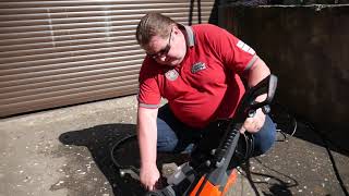 Работой устройства заправляет электродвижок мощностью 1750 Вт, обеспечивающий производительность труда алюминиевой помпы на уровне порядка 360 л/час. На выходе из сопла распылительного пистолета давление водяной струи достигает 125 бар, чего достаточно для борьбы с неподатливыми загрязнениями. Самую стойкую грязь поможет устранить химия — бачок для моющего средства в конструкции минимойки вмещает 700 мл жидкости.