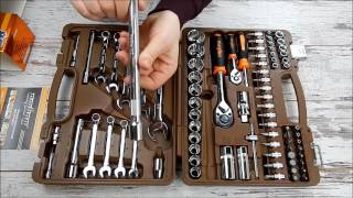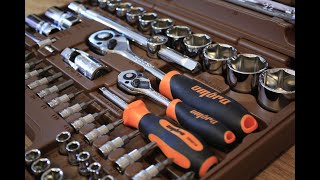 У тех, кто выберет OMBRA OMT82S в качестве «гаражного» набора, вряд ли возникнет необходимость докупать какие-то инструменты. Ведь в этом чемодане находится весьма «сбалансированный» комплект, который состоит из 9 комбинированных ключей, 25 торцевых головок с парой «трещоток» и 32 бит с отверточной рукояткой для них — все, что нужно, чтобы крутить гайки, болты и винты. В комплекте с инструментом идет большой ассортимент дополнительных аксессуаров: воротков, карданных шарниров и удлинителей (среди них даже есть гибкий «поводок»). Инструменты и головки сделаны из легированной стали CrV и имеют качественное хромированное покрытие, которое не облезает со временем. У «трещоток» живучие и надежные механизмы (к ним, кстати, продаются ремонтные комплекты, если вы друг переусердствуете и сломаете что-то). Единственное мелкое нарекание, которое встречается в отзывах на данный набор, — это недостаточно надежная фиксация переключателей на «трещотках» (иногда их во время работы приходится придерживать пальцем, если орудовать ключом очень быстро).