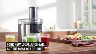 В отверстие диаметром 75 мм запросто пролезут крупные сливы, персики, абрикосы, любые ягоды и небольшие яблоки. Мякоть откидывается автоматически, а сок перед поступлением в резервуар проходит через пеносепаратор. Как и все центробежные соковыжималки, эта модель шумновата, особенно если закидывать фрукты и овощи целиком, не порезав на дольки.