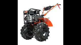 Механизированный помощник земледельца оборудован силовым агрегатом, состоящим из 4-тактного двигателя Patriot P 175 FС (мощность 7.8 л.с., объем 220 см3) с воздушным охлаждением, клиноременного сцепления (есть шкив отбора мощности) и цельнолитого чугунного редуктора с цепной передачей. Двигатель по всему периметру огибает трубчатый бампер-протектор, а колеса и навесы редуктора прикрыты защитным щитком. Поворотная и вертикальная регулировка рукоятки позволяет настроить оптимальное положение ручек для управления машиной, а в прикрепленном к ним контейнере сложены ключи для быстрого крепления навесов. Мотоблок способен двигаться вперед на одной из 4 передач в диапазоне скоростей от 4 до 7.7 км/ч, а задний ход обеспечен двумя передачами. Реализация перехода с пониженной передачи на повышенную выполняется вручную перевешиванием клиновидного ремня на другой ручей шкива. Снаряженная масса машины составляет 105 кг, что позволяет фрезам при ширине культивирования 90 см легко закапываться в грунт на глубину до 30 см.