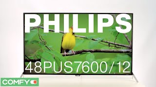 Эта модель представляет собой даже не столько сетевой телевизор, сколько продвинутый медиацентр на базе Android TV, оснащённый 55" экраном. Сходство усиливает наличие в конструкции собственного 16-ГБ накопителя. Впрочем, и более традиционные возможности LCD-телевизора Philips 55PUS7600 весьма впечатляют. Здесь прежде всего стоит упомянуть экран с подсветкой Ambilight, разрешением 3840x2160 и индексом динамических сцен 1400 кадр/сек, способный к тому же воспроизводить 3D (в т.ч. с конвертацией 2D). Приём цифрового вещания обеспечивают 5 тюнеров, поддерживается запись телепрограмм и технология Miracast. Телевизор имеет 2 CI-слота. В комплекте поставляются 2 пары 3D-очков.