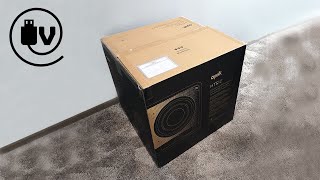 Сабвуфер представляет собой цельную конструкцию на подиуме с просветом между корпусом и основанием. Это сделано для того, чтобы обеспечить порту фазоинвертора, направленному в пол, свободный выход воздуха. Технология получила название Power Port.