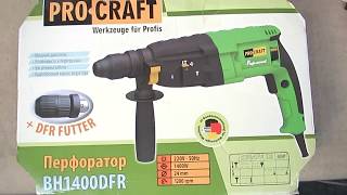Трехрежимный сетевой перфоратор бытового класса. Двигатель имеет мощность 1400 Вт и скорость вращения до 1200 об/мин, а максимальная энергия удара равна 3 Дж. Перфоратор Pro-Craft BH-1400 DFR предназначен для сверления отверстий в бетоне диаметром до 24 мм (при использовании коронки — до 68 мм). При отключенной функции удара инструмент может сверлить металл (отверстия диаметром до 13 мм) и древесину (до 30 мм).