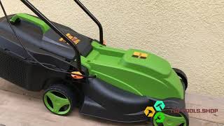 Переставляя колесные оси из паза в паз, пользователь может выбрать желаемую высоту кошения травы: 25 мм, 45 мм или 65 мм. Для сбора скошенной зеленой массы используется 30-литровый жесткий травосборник, сделанный из пластика. Передние и задние колеса имеют диаметр 14 см. Задняя рукоятка может складываться для уменьшения габаритных размеров во время хранения и при перевозке садовой техники в багажнике автомобиля.