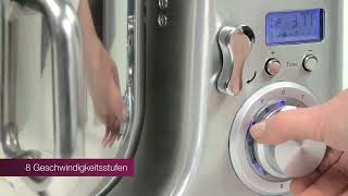 Набор аксессуаров довольно стандартный: вы получаете венчик для взбивания, лопатку для перемешивания и двойной крюк, который без проблем справляется с плотным тестом — дрожжевым, макаронным или для хлеба. Износостойкий корпус Profi Cook PC-KM 1096 сделан из литого алюминия и выдерживает интенсивное использование. Внутри установлен профессиональный двигатель на 1500 Вт с постоянной мощностью благодаря электронному регулированию числа оборотов в зависимости от нагрузки. Прибор плавно запускается и предлагает 6 скоростей с дополнительным импульсным режимом. Предохранительный выключатель останавливает двигатель при откидывании верхней части. Также полезным дополнением стал электрический таймер, который проследит за временем, необходимым на приготовление. Вся необходимая информация отображается на небольшом ЖК-дисплее.