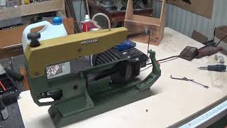 Двухскоростной стационарный электролобзик с бесщеточным двигателем мощностью 205 Вт. Может резать древесину толщиной до 50 мм, цветные металлы до 10 мм, а также менее плотные материалы, вроде пластика, пенополистирола, пробки и др. Большой вылет консоли (400 мм) позволяет свободно работать с достаточно крупными заготовками. Станина лобзика PROXXON DSH отлита из стали, а наклоняющийся на 45° столик размером 360x180 мм — из алюминиевого сплава. Станок оснащен регулируемой системой сдува опилок (стружка и опилки сдуваются потоком воздуха в специальный отсек на боковой части корпуса). Есть возможность подключения пылесоса. К данном станку подходят разные виды пилок: как те, что имеют штифтовое крепление (длиной 127 мм), так и обычные полотна с плоскими держателями (длиной 125 – 130 мм).