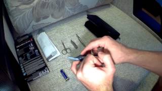Лезвия самозатачивающихся ножей двусторонней режущей головки выполнены из нержавеющей стали и покрыты специальным антимикробным напылением из наночастиц серебра, предупреждающим раздражение кожи. Технологическое решение ножевого блока Comfort trim обеспечивает легкость и безопасность работы. Узкая насадка ножевого элемента легко промывается водой благодаря специальному внутреннему каналу и защите корпуса от влаги. Модель дополнена 2 съемными насадками-гребнями с фиксированными длинами среза волос. Отдельного внимания заслуживает комплектация устройства, сравнимая по составу с маникюрным набором. В просторной тканевой косметичке с жесткими стенками, застегивающейся с помощью змейки-молнии, помимо основного устройства с насадками, нашли себе место: ножницы, косметический пинцет, пилка и щипцы для ногтей, а также щелочной гальванический элемент для питания триммера.