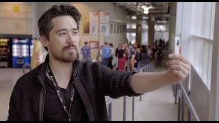 Не совсем видео- и уж тем более не экшн-камера, а эдакий эксклюзивный фотоаппарат с возможностью съёмки 360-градусных панорам. Обе стороны вытянутого корпуса девайса украшены выпуклыми линзами объективов, каждый из который захватывает в поле зрения 180° окружающей действительности. После нажатия на кнопку спуска затвора Ricoh Theta M15 делает панорамный фотоснимок, просмотреть который можно в предварительно загруженном на «мобильник» фирменном приложении.
