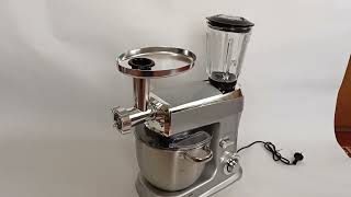 В комплектацию миксера входят три стандартные насадки: венчик для взбивания легких масс, крюк для замешивания теста и плоская лопатка для перемешивания. Также Royalty Line PKM-2100BG позволяет установку блендера и мясорубки, которые тоже включены в набор. Блендер состоит из острого ножа, стеклянного кувшина объемом 1.5 л и герметичной крышки, а мясорубка предлагает все необходимое для приготовления различных мясных изделий и прочих блюд: три диска для фарша с отверстиями разного диаметра и специальные насадки для формирования домашних колбас и полых мясных трубочек (кеббе). Что касается основных характеристик, кухонный комбайн имеет мощность 2100 Вт, 6 скоростей с плавной регулировкой и отдельный импульсный режим. Также стоит отметить светодиодную подсветку регулятора скоростных режимов и систему защиты двигателя от перегрева.
