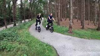 Байк отлично себя ведет как на ровных дорогах с твердым покрытием, так и на легком бездорожье. Неровности дорожного полотна под колесами велосипеда гасятся передней пружинно-эластомерной вилкой и подседельной амортизацией. На 20-дюймовые колеса сити-байка повешены надежные и эффективные дисковые механические тормоза. Рама у модели складываемая, однако в сборе она весит 25 кг — на поверку велосипед выдался тяжеловатым.