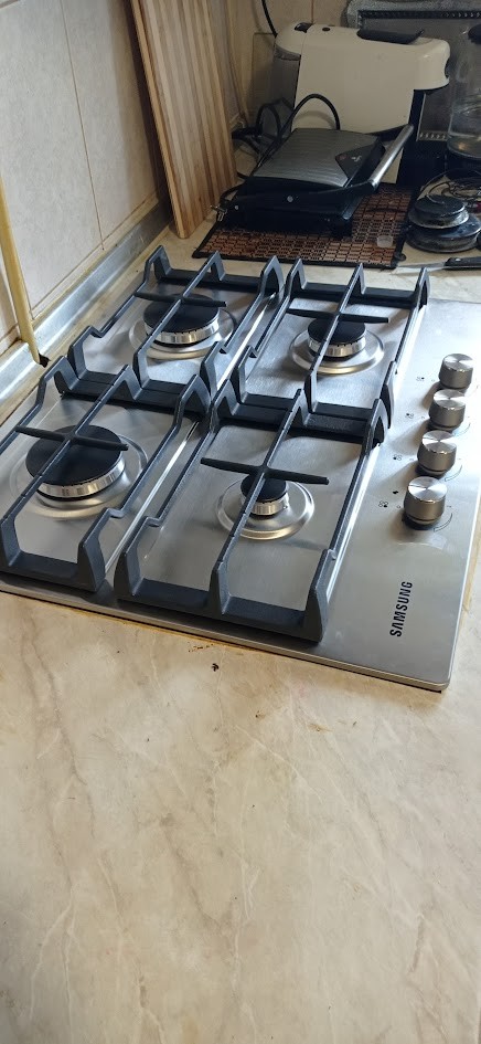 Купив цю газову поверхню Samsung NA64H3010AS і можу сказати, що загалом задоволений. Виглядає вона дійсно цікаво — нержавійка акуратна, решітки з чавуну важкі й стоять стабільно, нічого не хитається. Користуватися просто: підпал спрацьовує з першого разу, регулятори зручні, полум’я рівне й вистачає потужності для звичайного приготування. Комфорки сильні, вода закипає швидко.