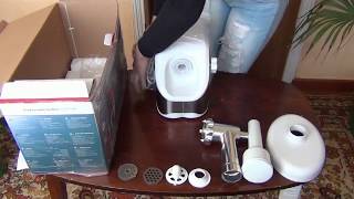 . Мясорубка с высокой мощностью и средним набором возможностей. Оснащена мотором на 1800 Вт, а насадок в комплекте поставляет 4: диски для фарша, барабаны для тёрки, приспособления для кеббе и мягких овощей. Загрузочный лоток имеет толкатель для облегчения подачи продуктов. Также стоит отметить защиту от перегрузок. Корпус выполнен из стали.