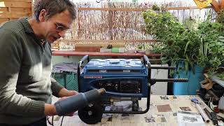 Передвижной бензиновый генератор, рассчитанный на обслуживание нагрузки до 2 кВт. У него есть две розетки 230 В (каждая из них имеет ограничение в 16 А по допустимому току) и выход 12 В (в виде разъема под вилку с двумя плоскими контактами, расположенными под углом). Генератор Scheppach SG 3200 оснащен 4-тактным двигателем, имеющим рабочий объем 196 см3 и мощность 6.5 л.с. Для запуска мотора используется тросик. Топливный бак вмещает 15 литров бензина.