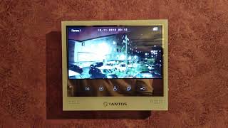 Под TFT-экраном диагональю 7 дюймов и разрешением 800х480 мм расположены 5 сенсорных кнопок управления, позволяющих работать с домофоном без трубки. В нижней части прибора скрыт микрофон и спикер, в правом торце находится слот для карты памяти SDHC microSD объемом от 8 до 32 ГБ (приобретается отдельно), а чуть ниже — джойстик для навигации в меню. Встроенная память позволяет записывать лишь 100 фотоснимков, при установке карты памяти становится доступна запись до 100 видеофрагментов, а объем сохранения фото может увеличиваться до 1000 фото. Разрешение сохраняемых снимков и видео составляет 720х480, что обеспечивает четкую картинку для распознавания приходящих посетителей. Кроме возможностей записи в память устройство поддерживает настройку 6 мелодий вызова, внутреннюю коммуникацию по адресному интеркому и громкую связь.