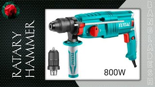 Сетевой перфоратор, имеющий мощность 800 Вт и энергию удара 2.5 Дж. Патрон рассчитан на использование буровых и ударных принадлежностей с хвостовиками SDS+. С помощью перфоратора Total TH308268 можно делать отверстия в бетоне (диаметром до 26 мм) и кирпичной кладке (до ⌀68 при сверлении кольцевой коронкой), древесине (до ⌀30 мм), металле (до ⌀13 мм) и других материалах. Функция долбления без проворота оснастки (режим отбойного молотка) позволяет выполнять простые демонтажные работы, вроде сбивания отделки и облицовочной плитки. К перфоратору прилагаются дополнительная рукоятка (крепится на шейке инструмента и может поворачиваться в удобное положение) и металлический ограничитель (используется для серийного сверления одинаковых отверстий определенной глубины). В комплект также входят пластиковый кейс и небольшой набор оснастки SDS+ (три бура, плоское долото и пика с острым наконечником).