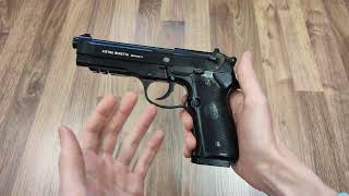 Также предусмотрена одиночная стрельба, режимы переключаются рычагом на тыльной стороне ствола. Гладкий ствол совместим со стальными шариками BB калибра 4.5 мм. Umarex Beretta M92 A1 относится к газобаллонному типу. Скорость выхода пули составляет 95 м/с — вариант для небольших дистанций до 20 м. Стоит отметить подвижный ствол, который откидывается назад при выстреле (технология Blowback), поэтому отличить пневматику от оригинала сложно. Модель довольно увесистая (1061 г) и сбалансирована благодаря металлическому корпусу. Пистолет удобно лежит в правой и левой руке. Предохранитель также выходит на обе стороны.