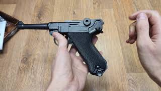 Мгновенно узнаваемый по своему силуэту Парабеллум Люгер. Точнее его пневматическая копия. Гладкий ствол калибра 4,5 мм, металлические шарики в качестве боеприпаса, для энергии выстрела используются сменные газовые баллончики, которые помещаются в рукоятку. Кроме стального ствола все остальные части сделаны из силумина, накладки рукоятки изготовлены и из пластика и имеют характерную насечку для надежного контакта с рукой стрелка. Большой угол наклона рукоятки делает процесс прицеливания простым и удобным.