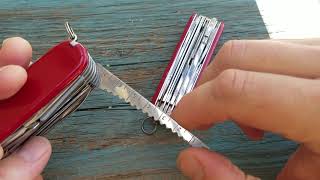 Еще швейцарский нож Victorinox Handyman имеет кусачки, пилку, причем как по металлу, так и по дереву, маленькие ножницы, стамеску и крюк. При вылазках на природу точно пригодится зубочистка, открывалка для бутылок, штопор и консервный нож. Плюс в наличии приспособление для зачистки проводов, шило для прокалывания отверстий и съемный пинцет. При обилии функций модель отличается достаточно небольшими размерами (длина рукоятки в сложенном виде составляет 91 мм). К другим особенностям относится присутствие кольца для крепления ремешка.