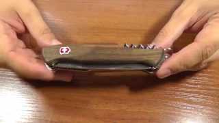 Удостоенный престижной дизайнерской награды Reddot Award швейцарский нож бренда Victorinox можно отнести к решениям на стыке средней и высшей ценовой категории. Внешнюю оригинальность ему помимо слегка изогнутой формы обеспечивают накладки на рукоятке, сделанные из орехового дерева. Сама модель относится к категории крупных, поскольку в сложенном виде длина составляет 130 мм, а вес равен 165 граммам.