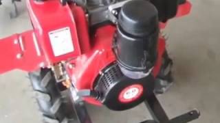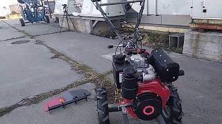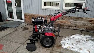 Запуск двигателя производится в ручном режиме. Но за счет того, что стартер укомплектован декомпрессором, пуск производится мягко и легко. Рулевая колонка имеет антивибрационную защиту. Положение руля можно регулировать сразу в нескольких плоскостях. Мощная приводная система позволяет задействовать достаточно производительный режущий инструмент. Почвенная фреза способна за один проход рыть колею шириной до 1100 мм. Фреза углубляется в грунт на 300 мм. Агрегат оснащен мощной и устойчивой колесной базой. Шасси укомплектован парой колес с глубоким тракторным протектором. Данная модель рассчитана на многочасовую плодотворную работу. Благодаря высокому уровню эргономии конструкции мотоблока, оператор будет испытывать минимальные физические нагрузки.