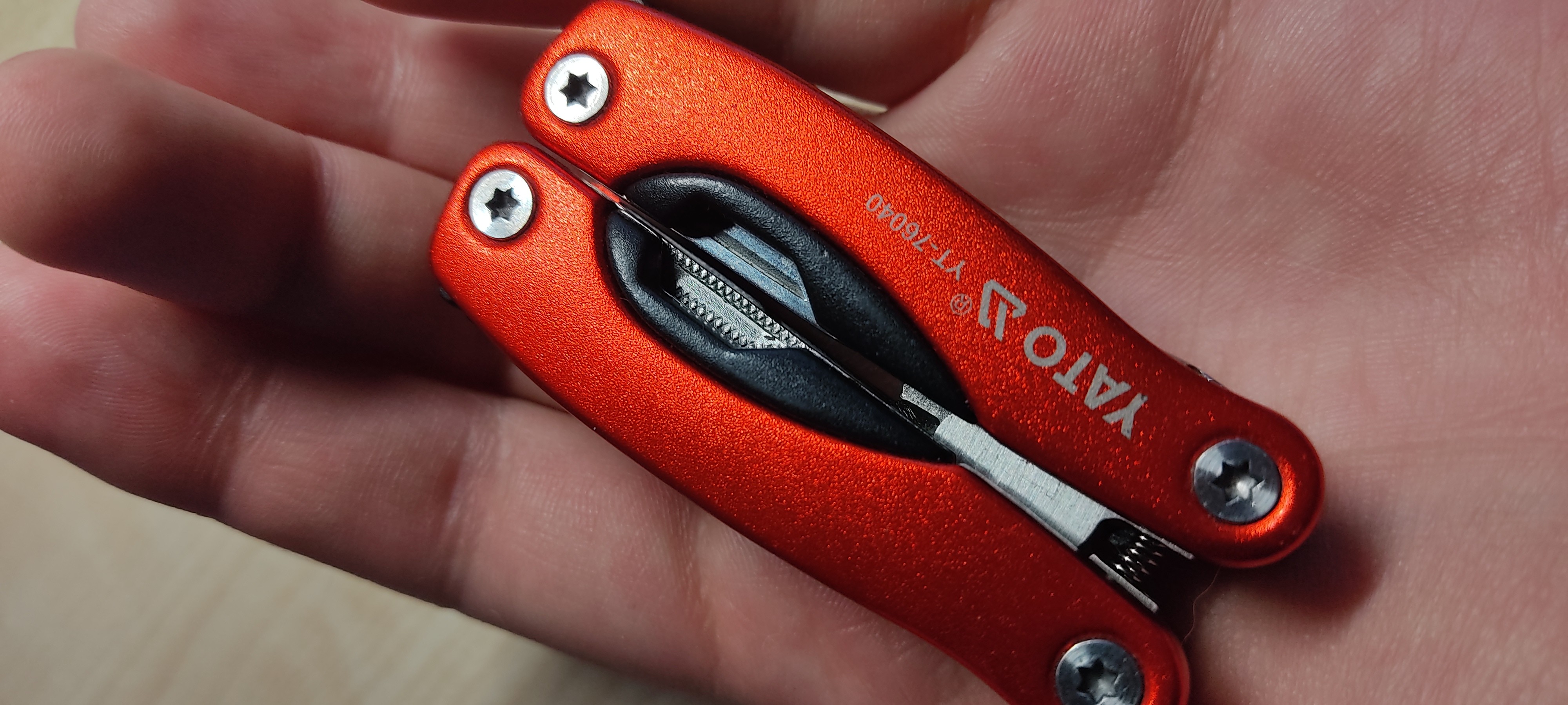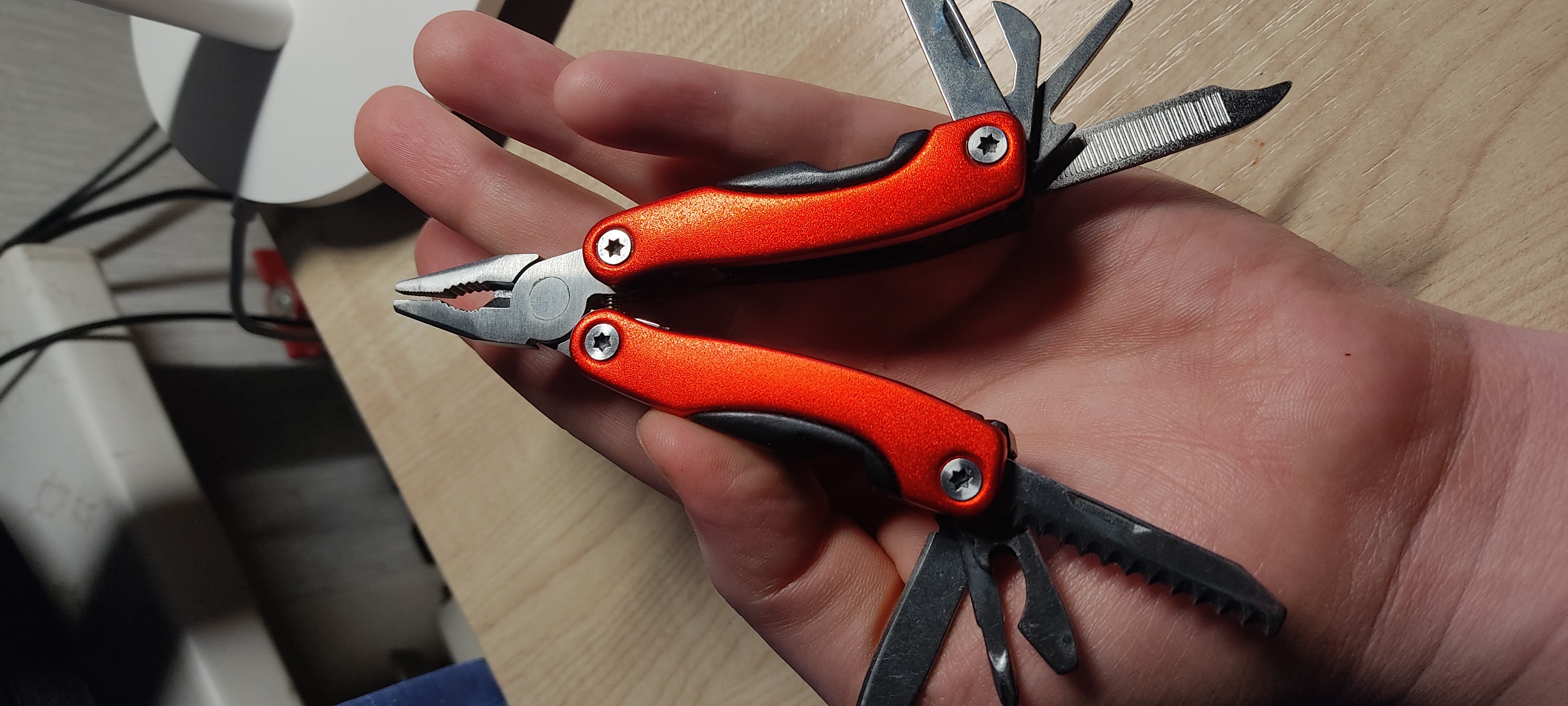 Виконаний мультитул доволі гарно, ручки з анадованого алюмінія, основа сталева. Яскравий колір допоможе якщо інструмент впаде у траву, буде легще знайти. Обробка плоскогубців доволі непогана, виглядає якісно. Ножі приїхали не загостренні, довелось самим їх гострити, що доволі незручно оскільки клинок доволі невеликий через рохміри мультитула, в будьякому "швейцарському" ножі лезо довше.