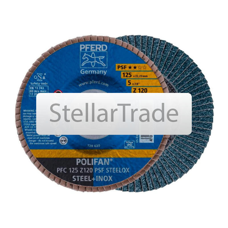 Шлифовальный круг Pferd PFC 125 Z120 PSF STEELOX 125 мм - универсальный веерный шлифовальный круг PSF-Z с повышенными требованиями к инструменту, предназначенный для обработки сварных швов и кромок еще→на стали и нержавеющей стали. Агрессивная характеристика обработки обеспечивает высокую производительность съёма материала при использовании мощных углошлифовальных машин с повышенным прижимным