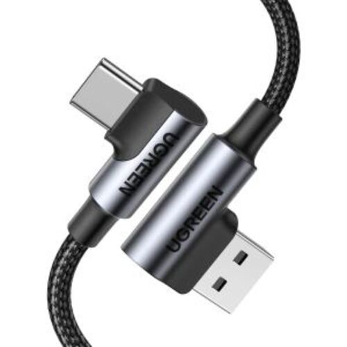 Угловой кабель UGREEN USB-A–USB-C 1 м, 3A, 480 Мбит/с, алюминиевый корпус, оплётка TPE + нейлон.