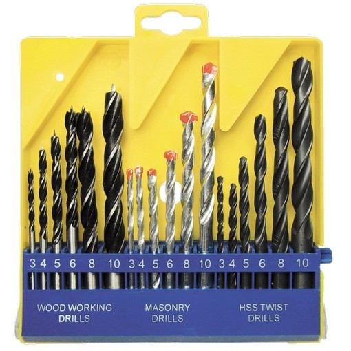 Комбинированный набор с различными типами сверл (по дереву, по металлу и по бетону) наиболее распространенных размеров.Сверла по бетону изготовлены из углеродистой стали и оснащены твердосплавными нап еще→айками.Сверла по металлу из быстрорежущей стали (HSS).Сверла по дереву из углеродистой стали.В набор 72545 входят еще и биты из стали 45Х.Сверла предназначены для бытового использования.Упакованы в пластмассовый пенал.