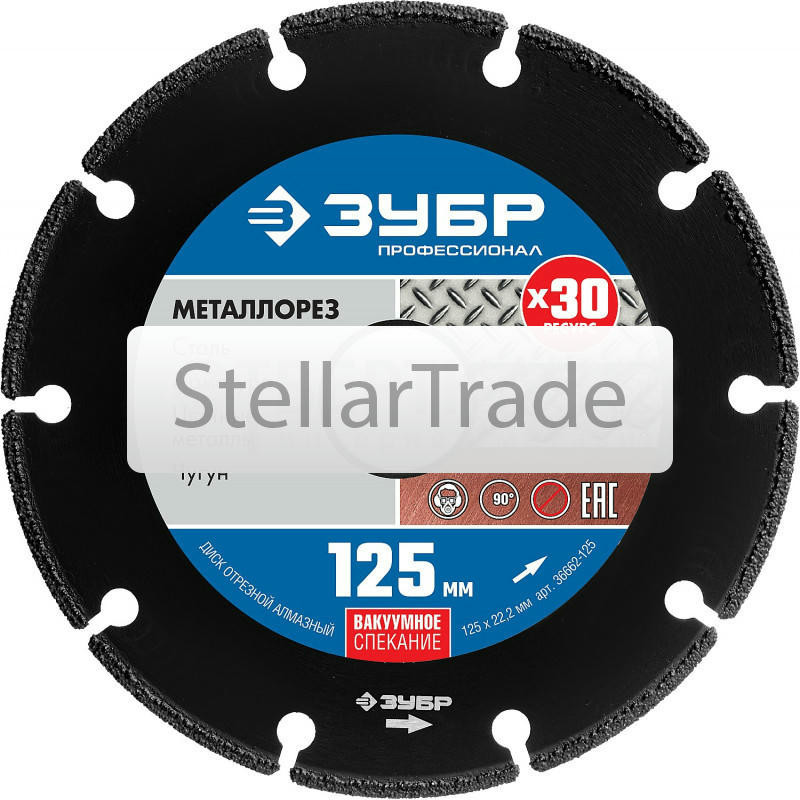 Алмазные отрезные диски ЗУБР ″СТАЛЬ-Про″ разработаны на основе современной технологии резки металлов алмазами. Преимущества ЗУБР 36662-125: Технология ВВС (Высокотемпературно еще→е Вакуумное Спекание алмазов) позволяет использовать диск для резки цветных металлов, стали, чугуна, арматуры без обязательного водяного охлаждения. Длительный срок службы. Ресурс