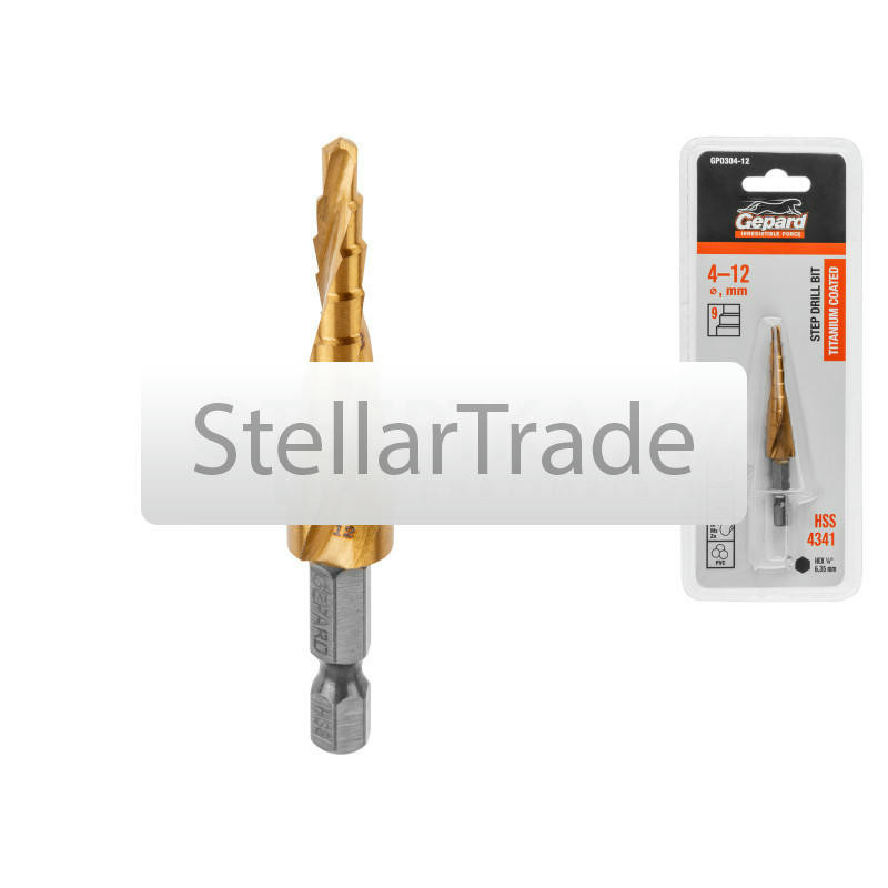 --- Технические характеристики: Назначение: для сверления отверстий различного диаметра 4-5-6-7-8-9-10-11-12 мм в листовых металлических и пластиковых материалах толщиной до еще→5 мм без перестановки режущего инструмента, Материал сверла: быстрорежущая сталь HSS 4341 (Р4М3), Профиль: спиральный, Покрытие: нитридтитановое, Тип хвостовика: шестигранный 1/4",