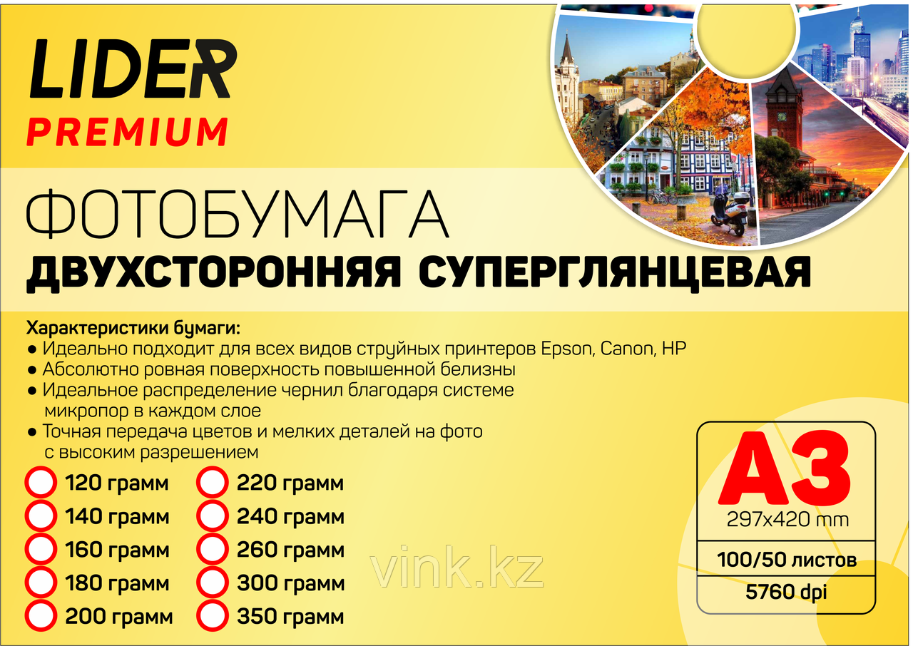 Данная фотобумага, идеально совместима с принтерами HP, Epson, Canon. Глянцевая фотобумага, двухсторонняя, премиум класса. Назначение: универсальная бумага для печати фотографий, буклетов, флаеров или еще→других рекламных материалов. Назначение: струйный принтер. Плотность, г/м2 240гр. Формат: A3, 297*420мм. Фасовка: 50 листов.