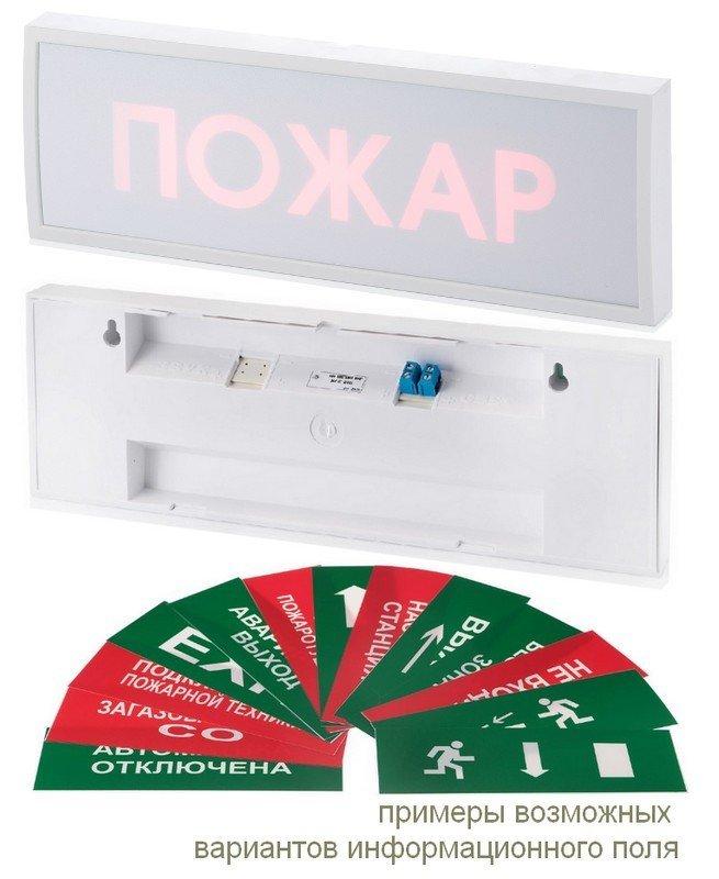 Назначение изделия Оповещатель световой "Молния-12" предназначен для обозначения эвакуационных путей в помещениях различного назначения. Корпус на защелке - с возможностью смены надписей. Особенности еще→Плоское табло на защелке с возможностью смены надписи