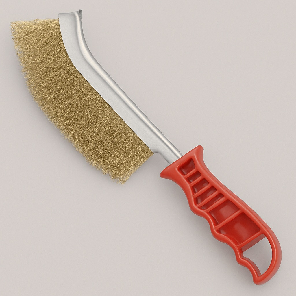 Щетка металлическая с латунной проволокой и пластиковой ручкой Эта прочная металлическая щетка оснащена густыми латунными ворсинками, идеально подходящими для очистки металла, удаления ржавчины, окали еще→ны и старой краски. Эргономичная пластиковая ручка с противоскользящими выемками обеспечивает комфортный и надежный захват даже при длительной работе. Легкая и удобная в