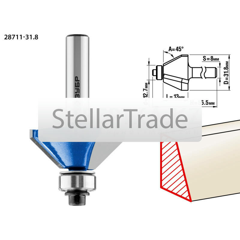 Фреза отлично подходит для изготовления фаски с заданным углом на кромках деталей при обработке столешниц, полок, шкафов и прочих работ с разнообразными видами древесины. Преимущества ЗУБ еще→Р 28711-31.8: Заточка производится только на самых современных станках с ЧПУ. Упорный подшипник позволяет обрабатывать криволинейные кромки без дополнительных