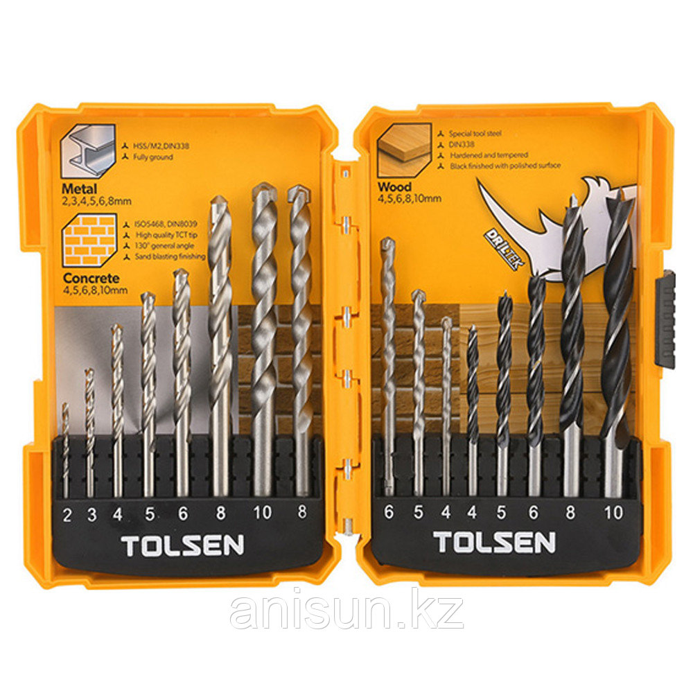 Набор сверл универсальных TOLSEN 2-10мм 16шт. 75628 - предназначен для работы с различными материалами, такими как дерево, металл, пластик и кирпич. Этот набор — универсальное решение для выполнения ш еще→ирокого спектра задач по сверлению в домашних и профессиональных условиях.Комплектация:Сверла по металлу: 2, 3, 4, 5, 6, 8 мм 6 шт.Сверла по дереву: 4, 5, 6, 8, 10 мм 5 шт.Сверла по кирпичу и бетону: 4, 5, 6, 8, 10 мм 5 шт.Кейс 1 шт.