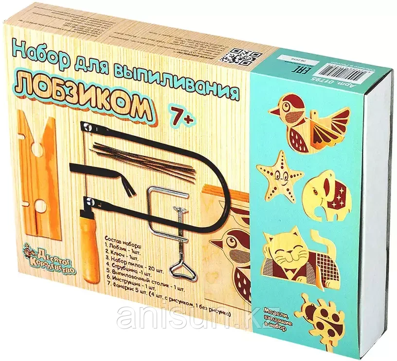 Набор для выпиливания лобзиком - это, в первую очередь, заготовки для изготовления поделок для дома или сада. В состав набора входит: 1. Лобзик - 1 шт; 2. Ключ для барашковой гайки - 1 шт; 3. Набор пи еще→лок - 20 шт; 4. Струбцина - 1 шт; 5. Выпиловочный столик - 1 шт; 6. Фанерки, размером 210х150х4 мм - 5 шт (с рисунком - 4 шт, без рисунка - 1 шт); 7. Инструкция - 1 шт.