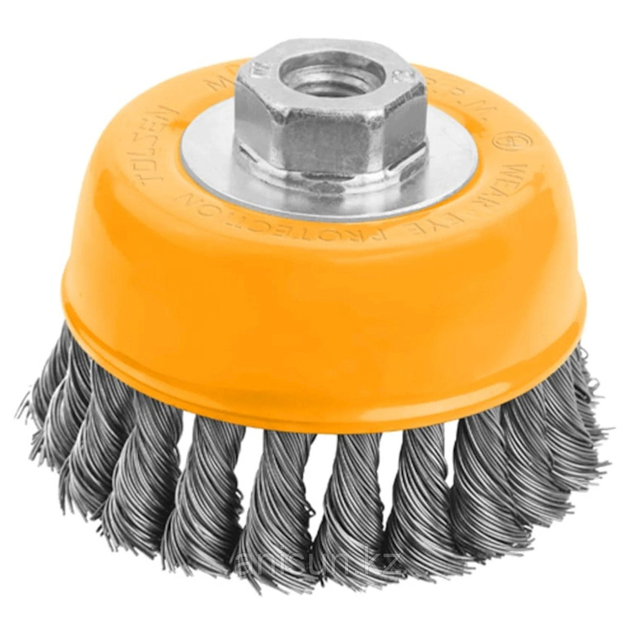 Щетка чашечная проволочная плетеная TOLSEN 125мм M10x1.5 0.5мм 77587 - предназначена для тяжелых очистных работ. Плетеная проволока обеспечивает высокую агрессивность при удалении ржавчины, краски и п еще→лотных загрязнений с металлических поверхностей. Толщина проволоки 0.5 мм делает этот инструмент идеальным для использования в задачах, требующих максимальной производительности и прочности. Подходит для угловых шлифмашин с креплением M10x1.5 и используется в промышленности и строительстве для интенсивной обработки.