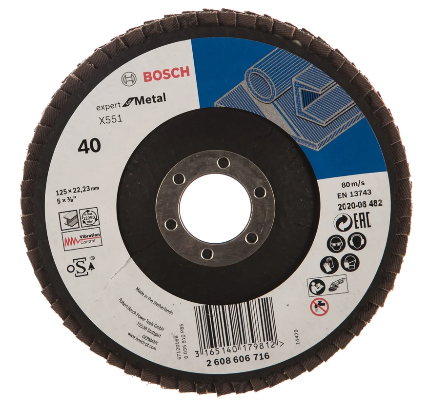 Описание: Лепестковый круг Bosch 2608606716 предназначен для угловых шлифовальных машин. Он изготовлен из прочной Х-ткани со связующим звеном из синтетической смолы. Абразивный материал данной оснаст еще→ки — цирконовый корунд (корунд повышенной чистоты), это обуславливает высокую производительность съема. Круг с прокладкой из стекловолокна подходит для шлифования металла, а также для работы по бетону. Вогнутая форма оснастки позволяет обрабатывать поверхности и сварные швы под установочным углом 15-25º. Максимальное число оборотов — 12250 об/мин.