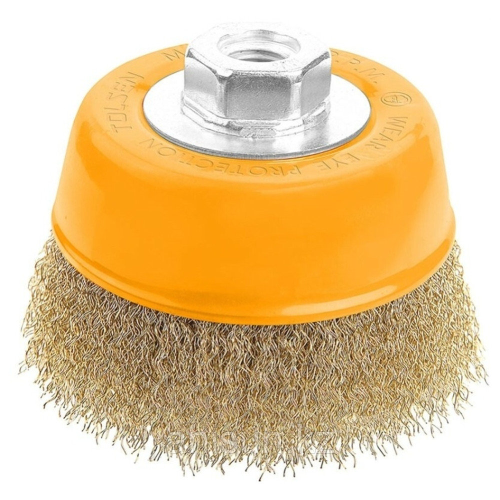 Щетка чашечная проволочная TOLSEN 75мм 5/8”-11 0.3мм 77561 - предназначена для очистки металлических поверхностей от ржавчины, краски и загрязнений. Тонкая проволока 0.3 мм подходит для более деликатн еще→ых работ, обеспечивая аккуратное удаление без повреждения материала. Щетка совместима с угловыми шлифмашинами, что делает её удобной для использования в бытовых и профессиональных задачах, требующих умеренной агрессивности.