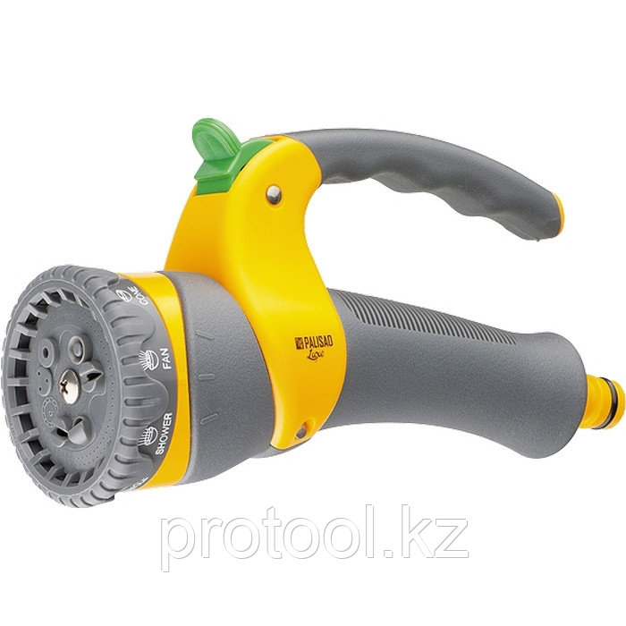 Пистолет-распылитель со штуцерной посадкой и удобной рукояткой, расположенной сверху. Оснащен регулируемой форсункой, что обеспечивает девять режимов полива: жесткую струю, центральное распыление, кон еще→усное распыление, плоско-горизонтальную струю, эффект водопада, распыление типа «туман», плоско-вертикальное распыление, душ, распыление под углом. На рукоятке имеется