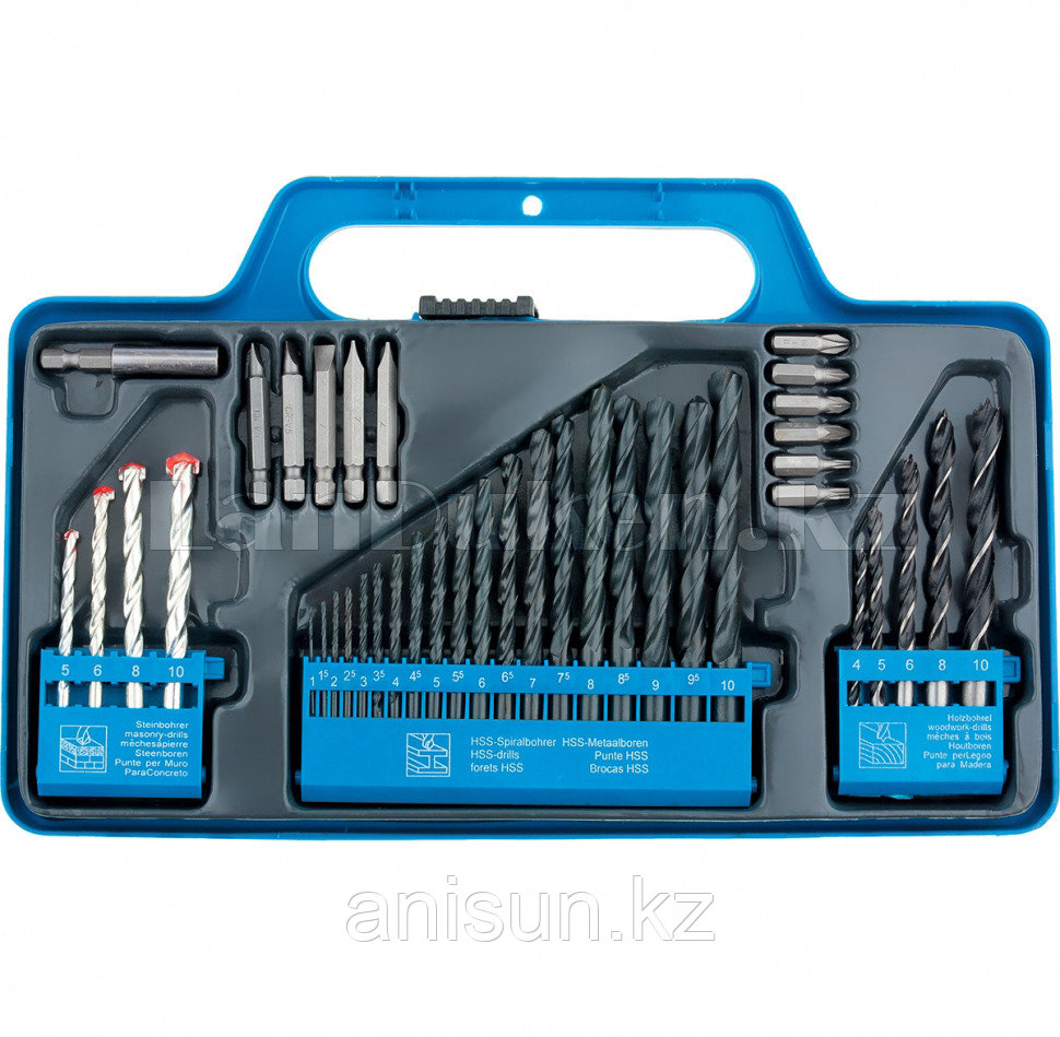 Комбинированный набор с различными типами сверл (по дереву, по металлу и по бетону) наиболее распространенных размеров. Свёрла по бетону изготовлены из углеродистой стали и оснащены твердосплавными на еще→пайками. Свёрла по металлу из быстрорежущей стали (HSS). Свёрла по дереву из углеродистой стали. В набор 72545 входят еще и биты из стали 45Х. Сверла предназначены для бытового использования. Упакованы в пластмассовый пенал.